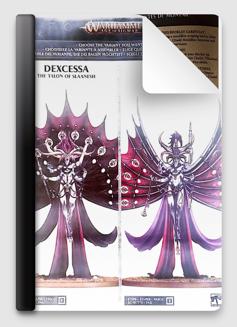 Includes a step-by-step user guide for how to build Dexcessa, the Talon of Slaanesh, from plastic sprue, through to a completed model which is fully assembled and ready to paint.