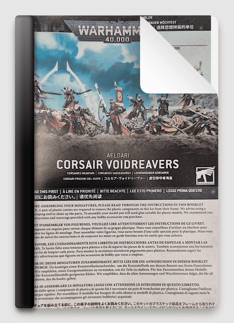 Includes a step-by-step user guide for how to build Corsair Voidreavers, from plastic sprue, through to a completed model which is fully assembled and ready to paint.