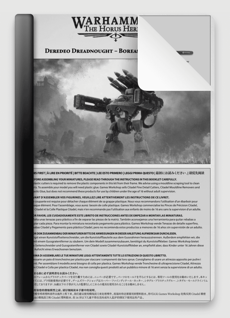 Download a Free PDF copy of the Instructions Booklet for How To Build Deredeo Dreadnought Boreas Configuration – Warhammer The Horus Heresy (30K). Full Assembly Instructions and step-by-step user guide for how to build Deredeo Dreadnought Boreas Configuration, available in PDF format as a Free Digital Download.