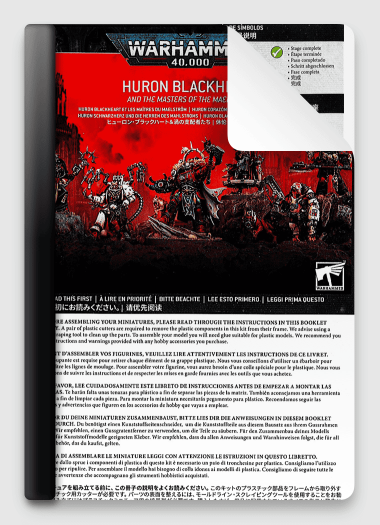 Includes a step-by-step user guide for how to build Huron Blackheart and the Masters of the Maelstrom, from plastic sprue, through to a completed model which is fully assembled and ready to paint.