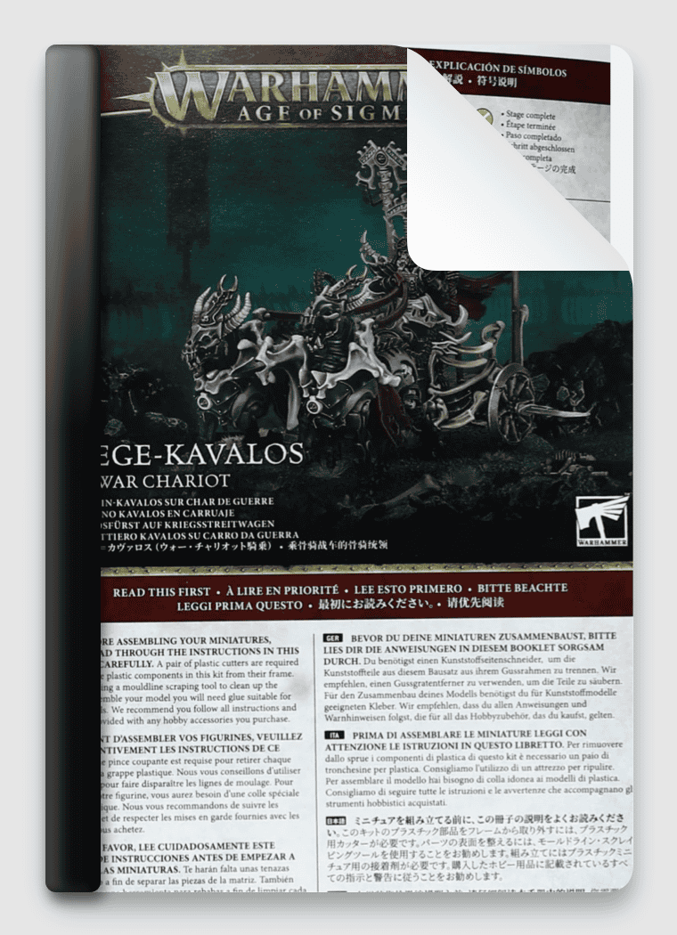 Includes a step-by-step user guide for how to build Liege-Kavalos on War Chariot, from plastic sprue, through to a completed model which is fully assembled and ready to paint.