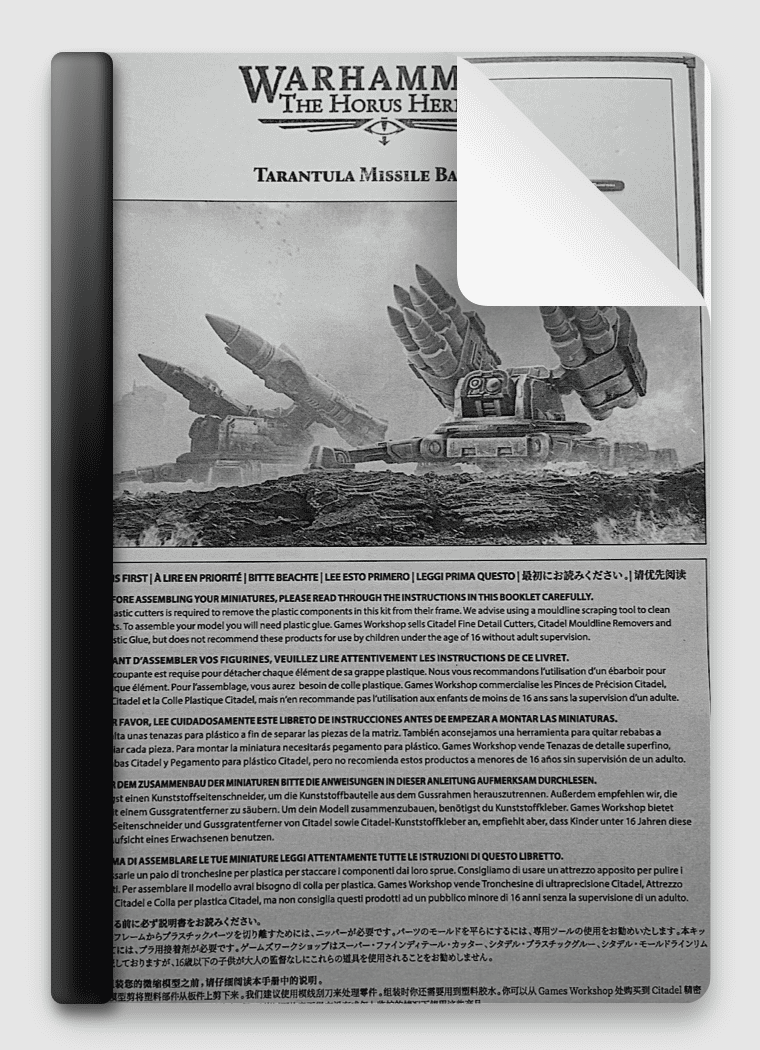 Includes a step-by-step user guide for how to build Tarantula Missile Battery, from plastic sprue, through to a completed model which is fully assembled and ready to paint.
